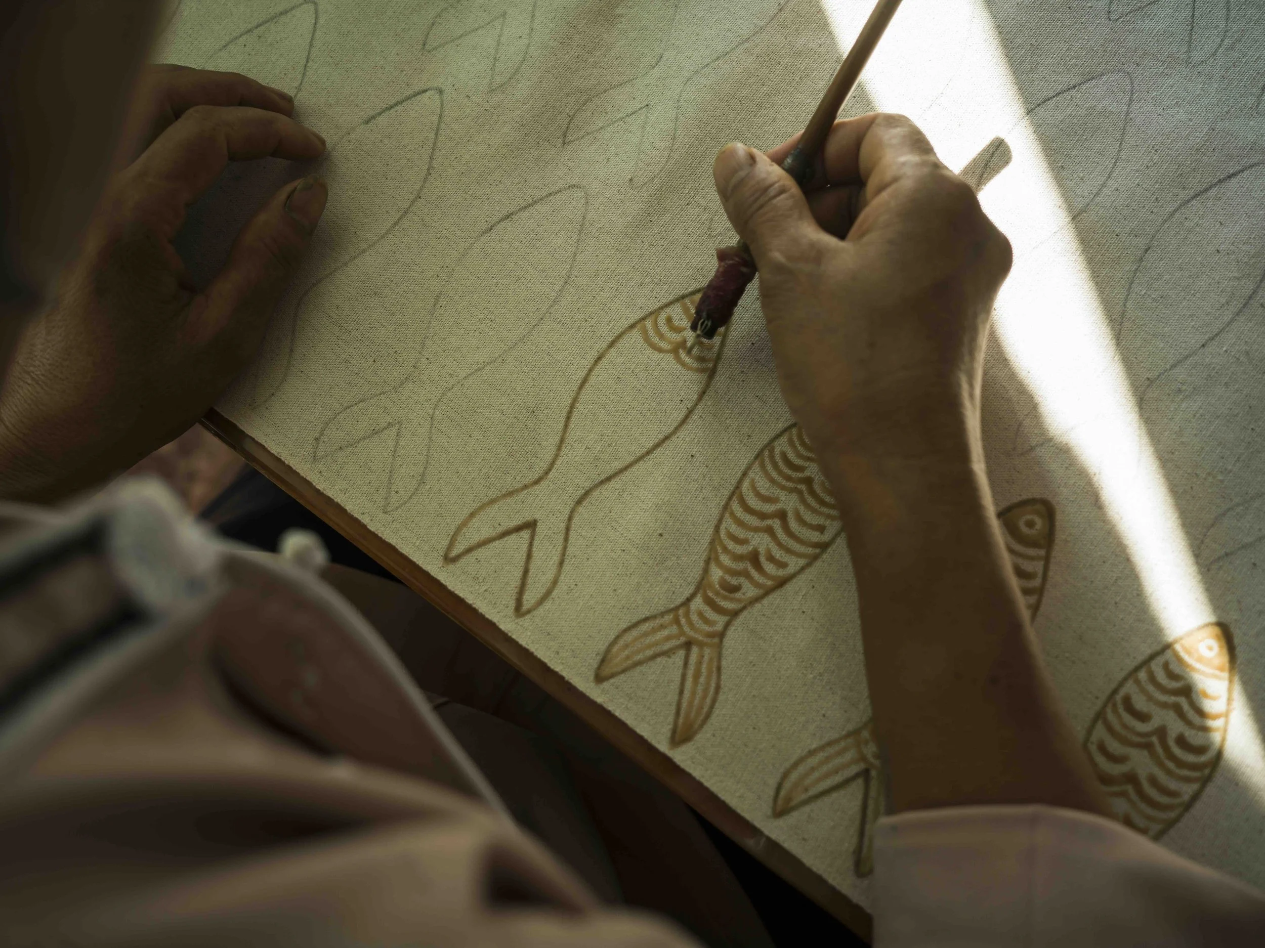 Wax Drawing: Beeswax or yellow wax is melted and applied to the fabric using a copper knife (铜刀), called a wax pen (蜡笔). It consists of two triangular brass blades tied to a handle, designed specifically to hold just enough melted wax for smooth drawing.