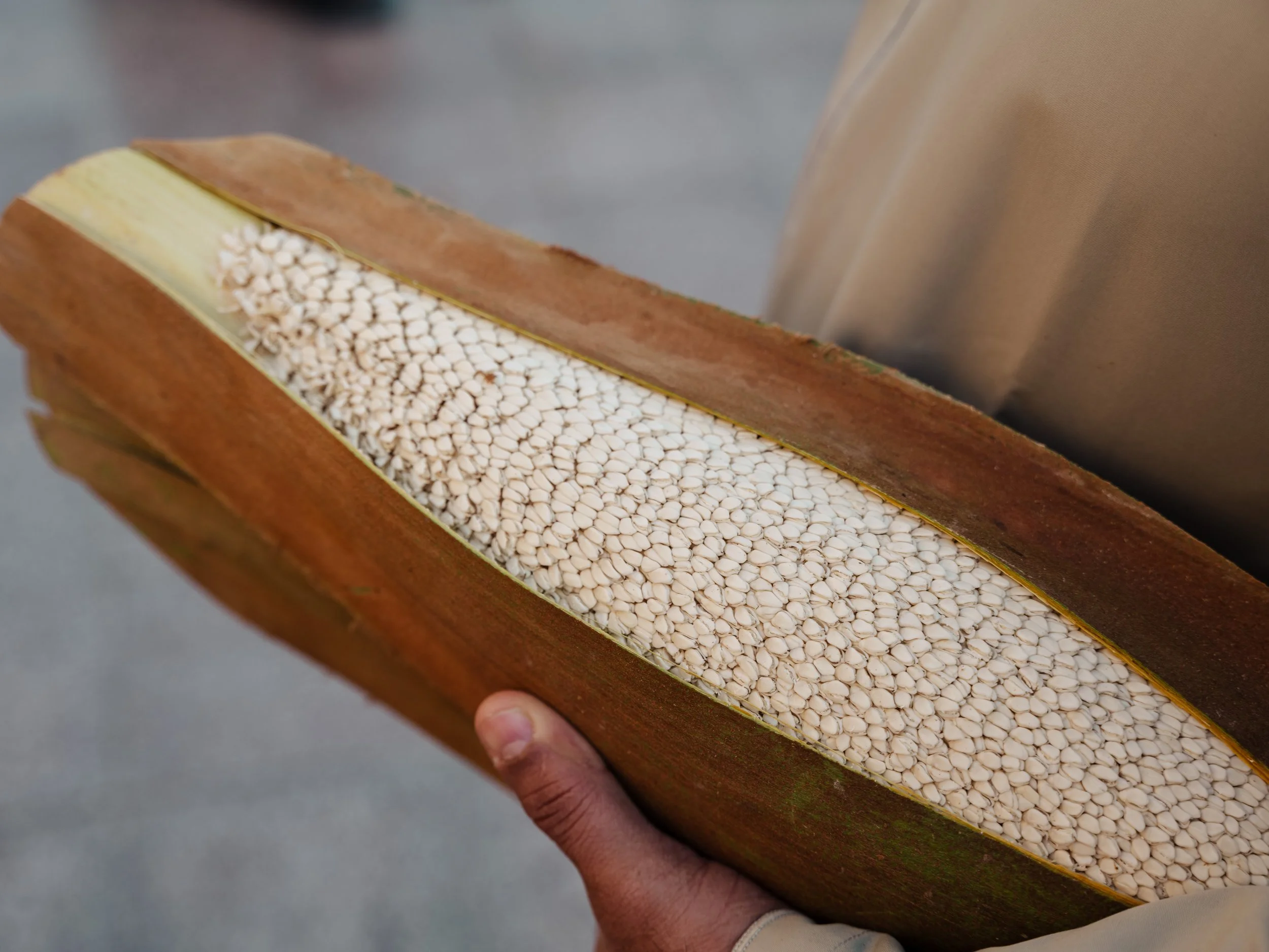 In Oman, dates are life, and the quality of the pollen determines the success of the entire season. You’ll see men crowded around what looks like a heavy, leathery wooden club. This is the male spadix of the date palm. One by one, they would take turns to bring it close to their nose, and perform a rigorous sniff test. They are evaluating its freshness, its potency, and its "life."